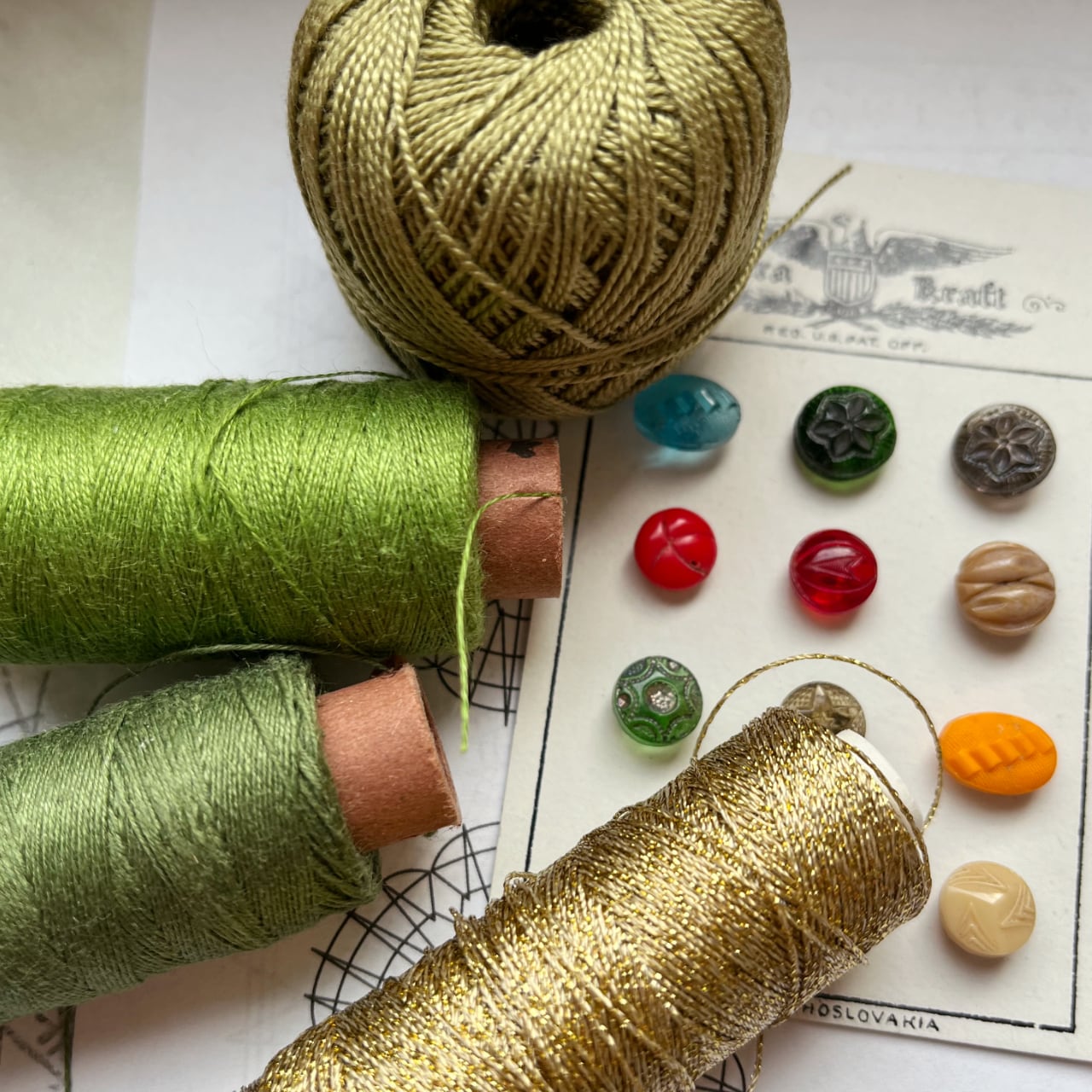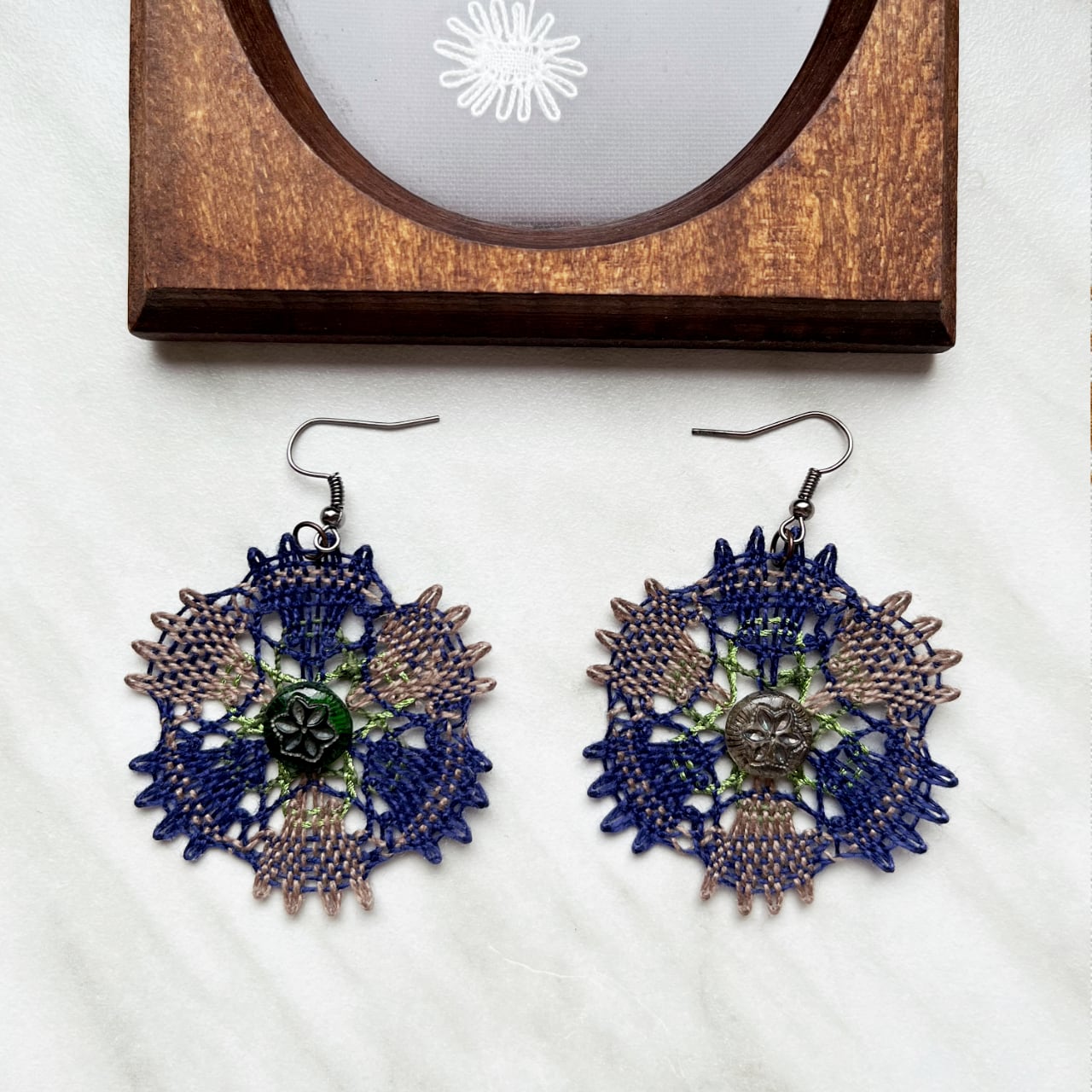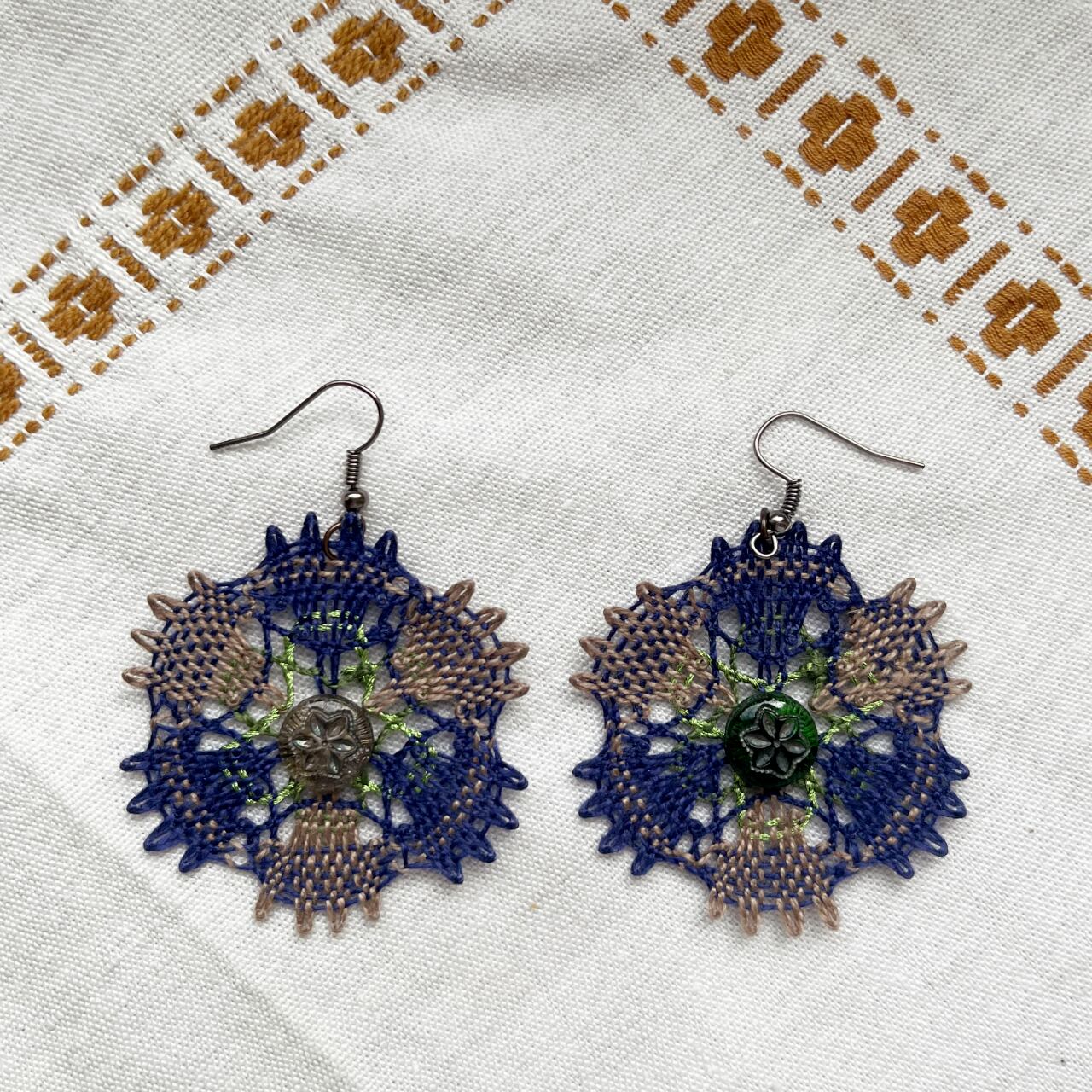 チェコの先生に習い、国の芸術工芸教育認定をいただいき、長くクラスを主催している作者。アンティークマーケットを歩いて見つけた、昔のガラスボタンを中心にデザインし、型紙にして、糸を選び、心を込めて編んだ世界に一つしかない作品。手にとって頂くだけで、その温かさと手仕事の美しさを感じて頂けることでしょう。