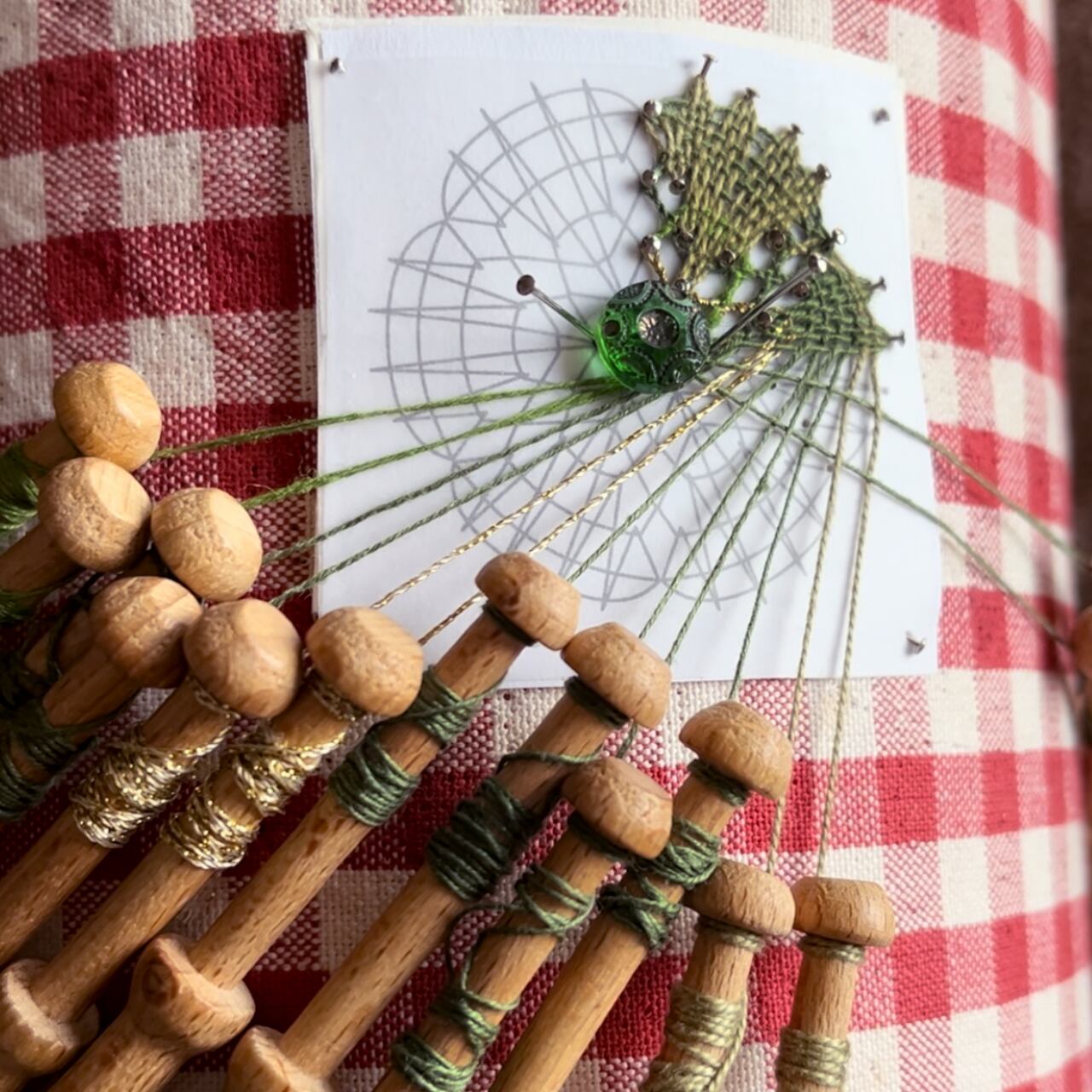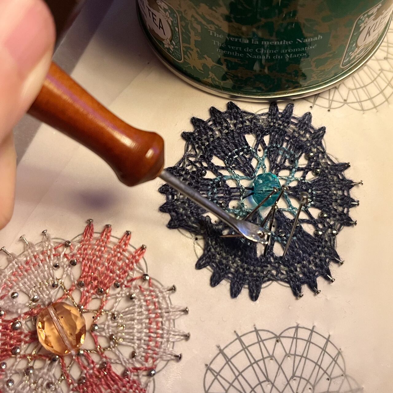 チェコの先生に習い、国の芸術工芸教育認定をいただいき、長くクラスを主催している作者。手芸店を歩いて見つけた、ガラスボタンを中心にデザインし、型紙にして、糸を選び、心を込めて編んだ世界に一つしかない作品。手にとって頂くだけで、その温かさと手仕事の美しさを感じて頂けることでしょう。